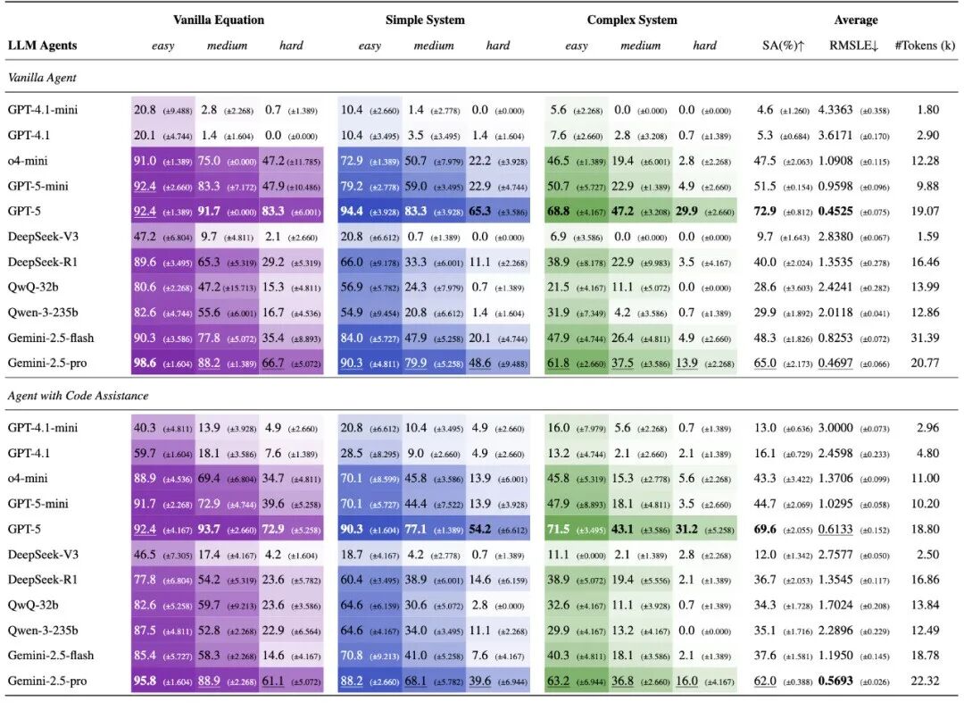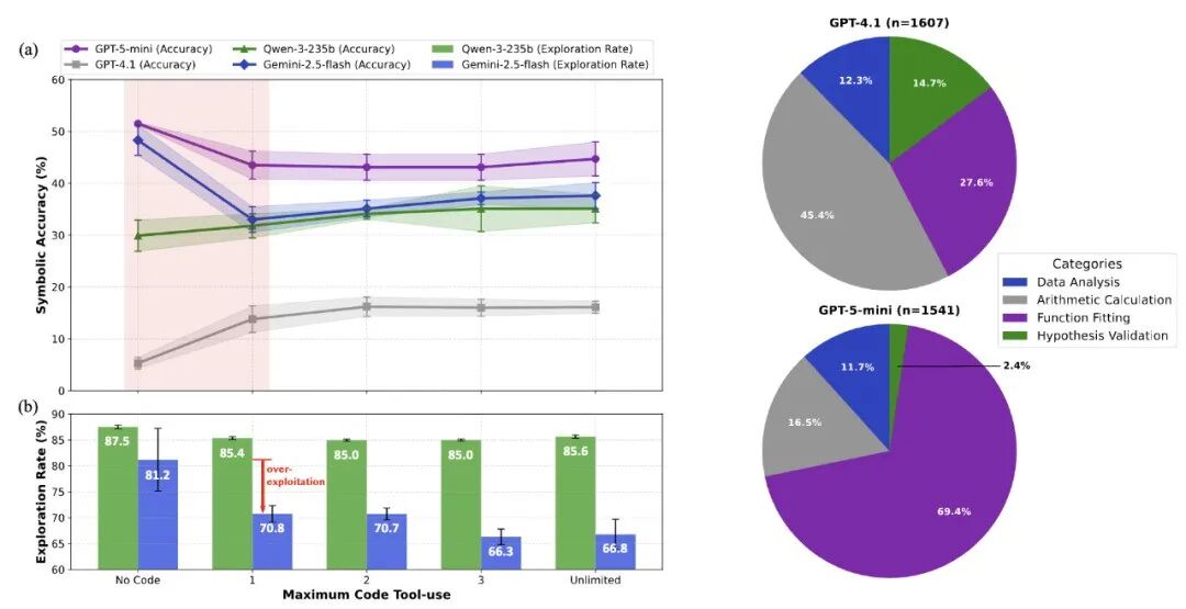 此外,研究人员深度解析了 GPT-4.1 与 GPT-5-Mini 的代码使用模式。在 GPT-4.1 中,45.4% 的代码调用集中于数值计算环节,而该比例在 GPT-5-Mini 中降至 16.5%。与之形成鲜明对比的是,GPT-5-Mini 将 69.4% 的代码资源投入函数拟合(function fitting)过程。这一发现印证了核心观点:对于基础模型,代码工具有效突破其计算瓶颈;但高性能模型将其大量用于快速获取局部最优解,反而抑制了对全局最优定律的探索空间。