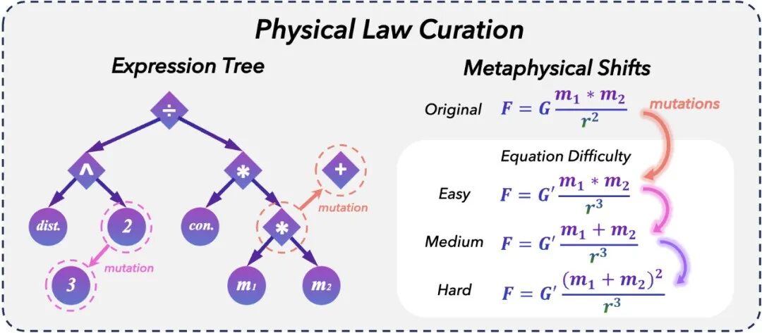 NewtonBench 包含 324 个物理定律发现任务,覆盖力学、电磁学、热力学等 12 个物理领域。其核心构建方法是:以真实物理定律为基础,在「形而上学变换(metaphysical shift)」框架下,通过等式变换操作(mutation operation)生成衍生定律。根据变换步骤的复杂度及其引入的泛化需求,任务被划分为简单、中等、困难三个难度等级。